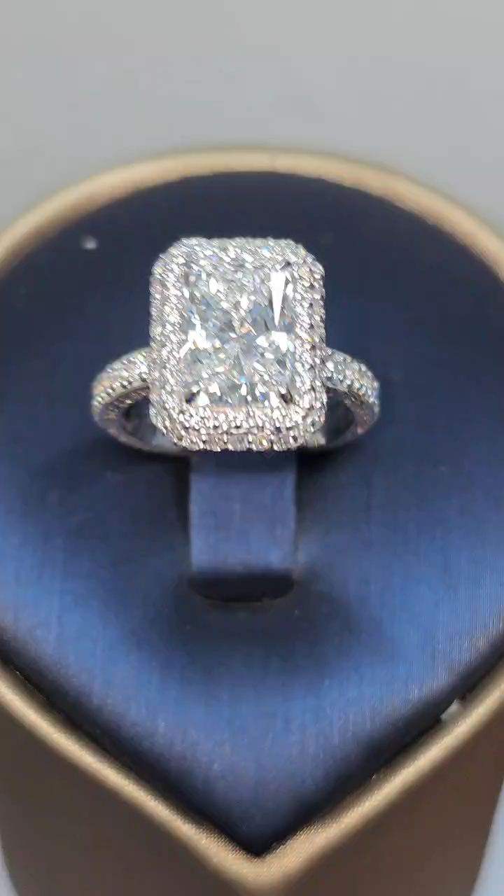 Radiant Beauty: The Allure and Elegance of a Hand-Selected Radiant Solitaire with Double Halo and Double Band Diamond Engagement Ring (Total Carat Weight: 4 Carats)