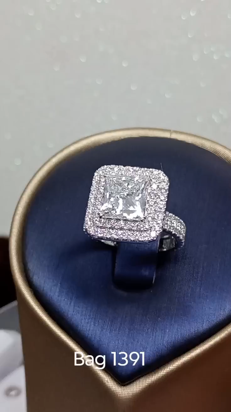 This stunning design features a square-shaped center diamond encircled by a halo of smaller diamonds, complemented by a 3-sided diamond-studded shank that ensures continuous sparkle from every angle. The result is a ring that is both bold and refined, with every detail carefully designed to maximize beauty and brilliance.